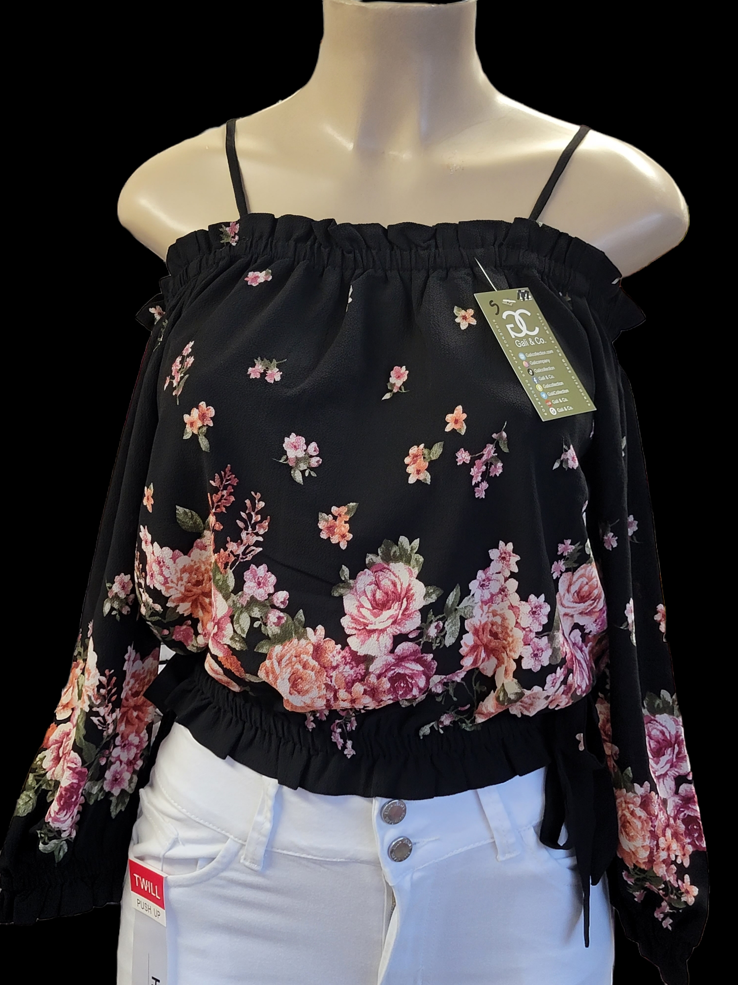 Off sleeve floral top BLACK