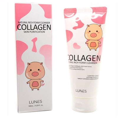 Lunes Collagen Natural Rich Foam Cleanser 6.09oz / 180ml A Natutal Rich Foam Cleanser with Collagen helps soothe and moistorize Skin. Collagen helps plump your skin up with layers of moisture and protection from everyday impurities